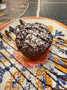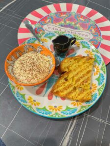 Babà al Rhum adagiato su letto di Crumble di biscotti ai Cereali, fave di Cacao e Noccioinfante con Panna ...