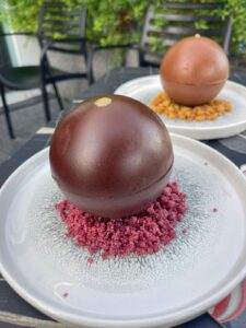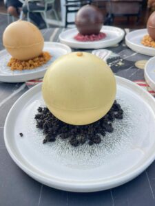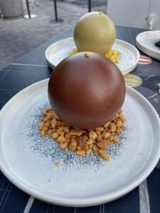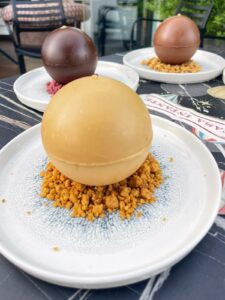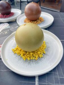 Sfera al cioccolato con cuore di Nutella ricoperta con pasta kataifi pronta per essere contaminata con crema al Pistacchiato